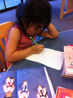 After Book Club we'll look for some books to check out and/or do a little homework. Today Thomas did a little homework so I suggested to Meredith that she copy words from a book of her choice. She enjoyed this activity so much that she brought the book home and continued the activity until dinner. I love how much they both enjoy learning.